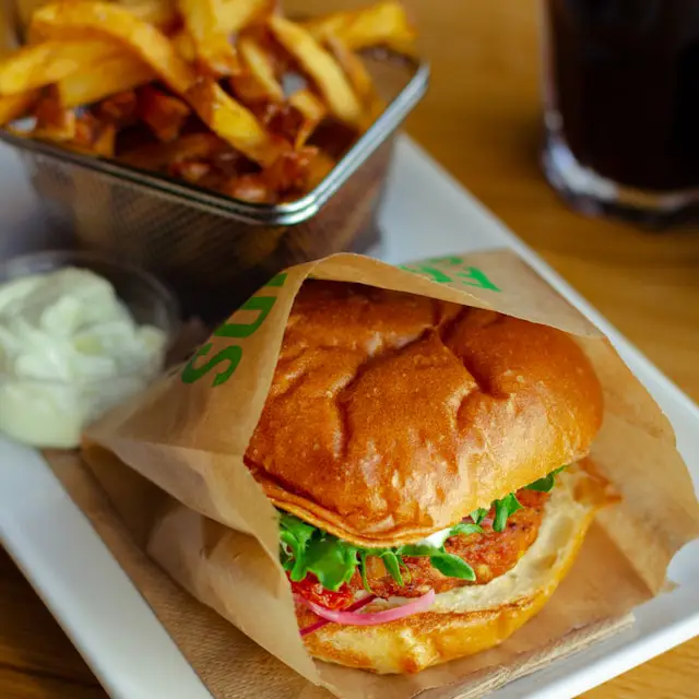 ÖZEL BURGER EKMEĞİ,100 GR. TAVUK KÖFTESİ, MOZZARELLA VE CHEDDAR PEYNİRİ KARIŞIMI SALATALIK TURŞUSU ÇITIR PATATES,ÖZEL OP’S SOS +BAHARATLI VEYA BAHARATSIZ PATATES KIZARTMASI -